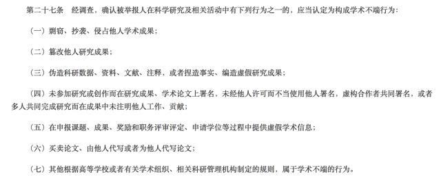 相信很多吃瓜群众还不知道“学术不端”的具体定义,或者把“学术不端”等同于抄袭。其实,目前世界上还没有关于学术不端的统一定义,每个国家都有自己的一套判定方法,但是论文抄袭、实验数据造假、考试作弊等行为是公认的学术不端行为,其中抄袭则是最常见的一种。下面来看我国关于学术不端的定义,根据2016年教育部发布的《高等学校预防与处理学术不端行为办法》,以下行为属于学术不端。如果网上翟博士的文章查重真的超了40%,那么就触犯了该《办法》的第二十七条的第(一)点,属于学术不端行为。