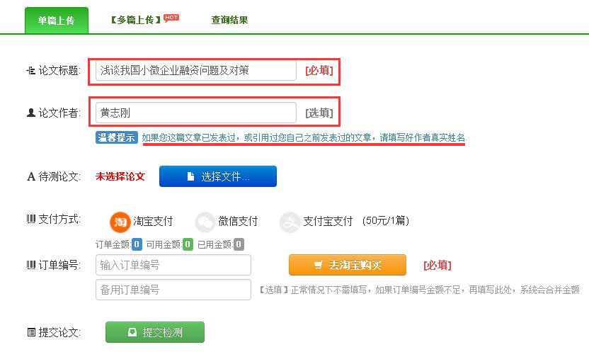 输入论文标题和作者。(如果您这篇文章已发表过,或引用过您自己之前发表过的文章,请填写好第一作者真实姓名.)