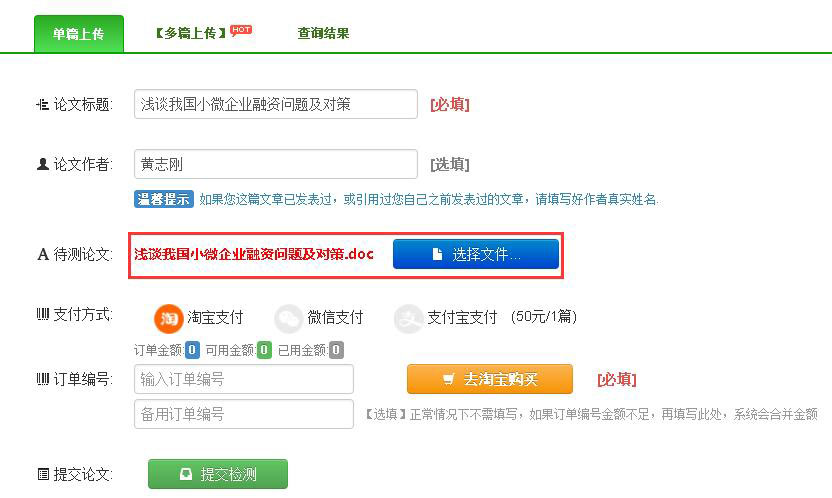 选择要检测的论文文件,必须是Word格式,不支持其他格式。点击【选择文件】按钮上传待检论文。【上传快慢根据个人网速决定】