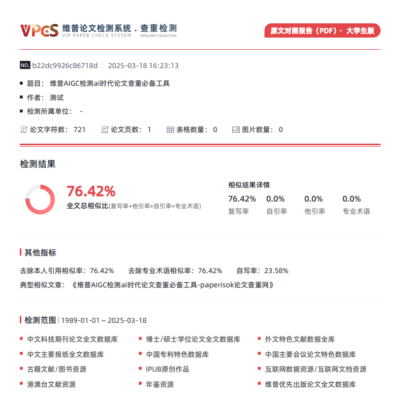 全文标红/片段对照/PDF报告/维普查重系统均由维普官方授权,绝对正版查重系统,虚假率为0。检测没有任何痕迹 不会对亲们的毕业造成任何影响