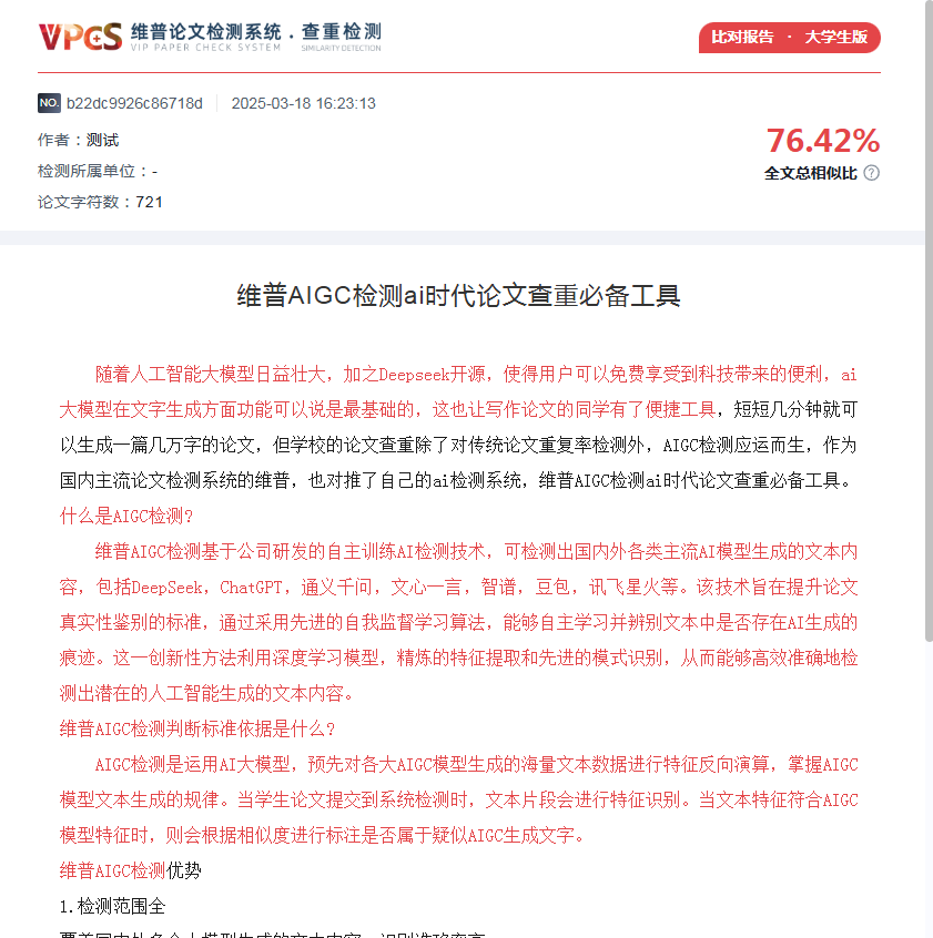 ...什么是AIGC检测? 维普AIGC检测基于公司研发的自主训练AI检测技术,可检测出国内外各类主流AI模型生成的文本内容,包括DeepSeek,ChatGPT,通义千问,文心一言,智谱,豆包,讯飞星火等...