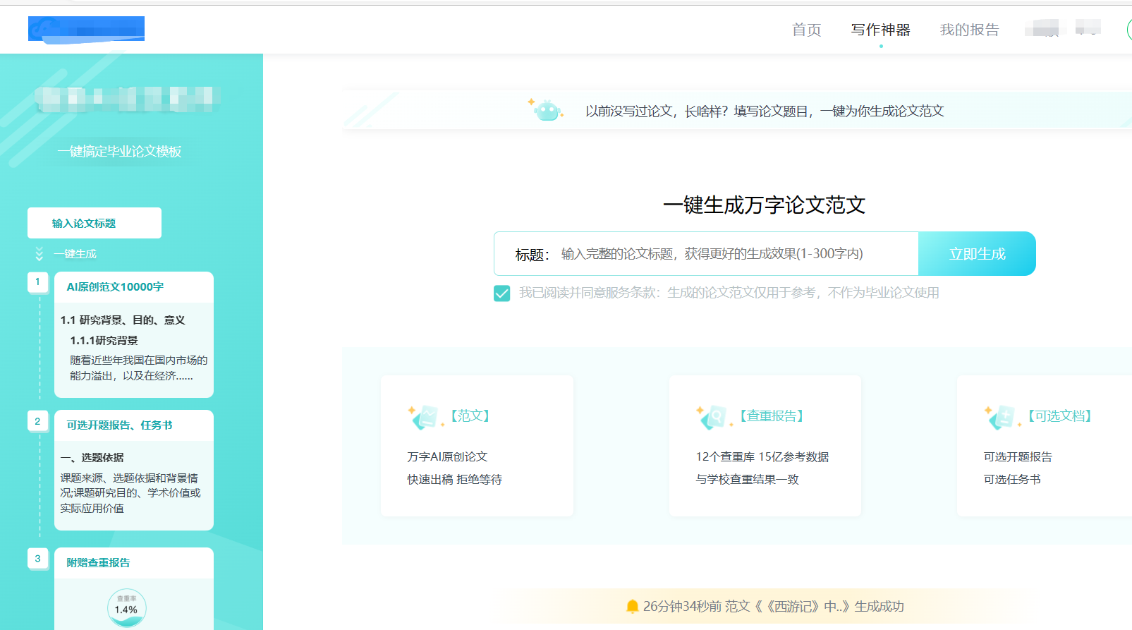 说明:AI论文写作申器一键生成原文+开题报告+任务书+查重报告,功能太强了!!